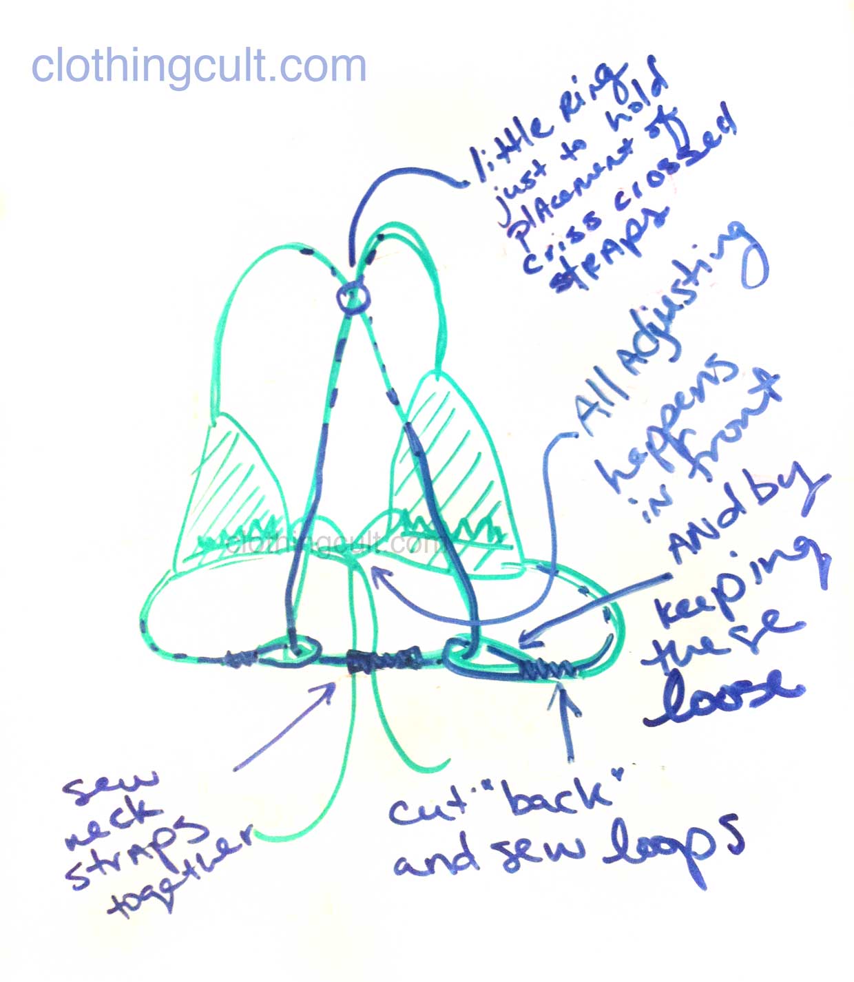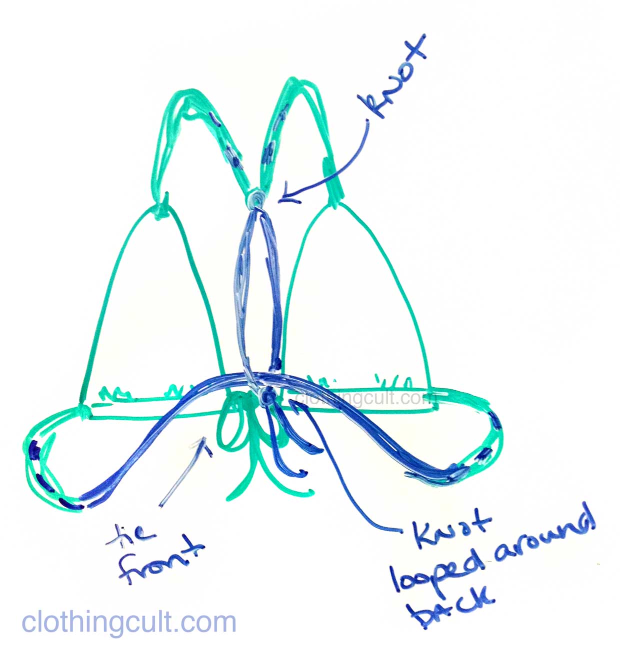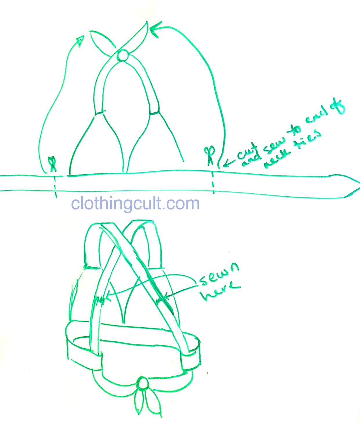 So I mentioned in my last post about swimsuits that I had a couple of ways to alter bikini tops so they don’t dig into my neck. One is no-sew and the other two require sewing and I’ll outline each of these, two of which are criss-cross or cross-back styles, with diagrams below. I’ve also done a quick video in case that helps you get a visual on how things came together on real bikini tops.