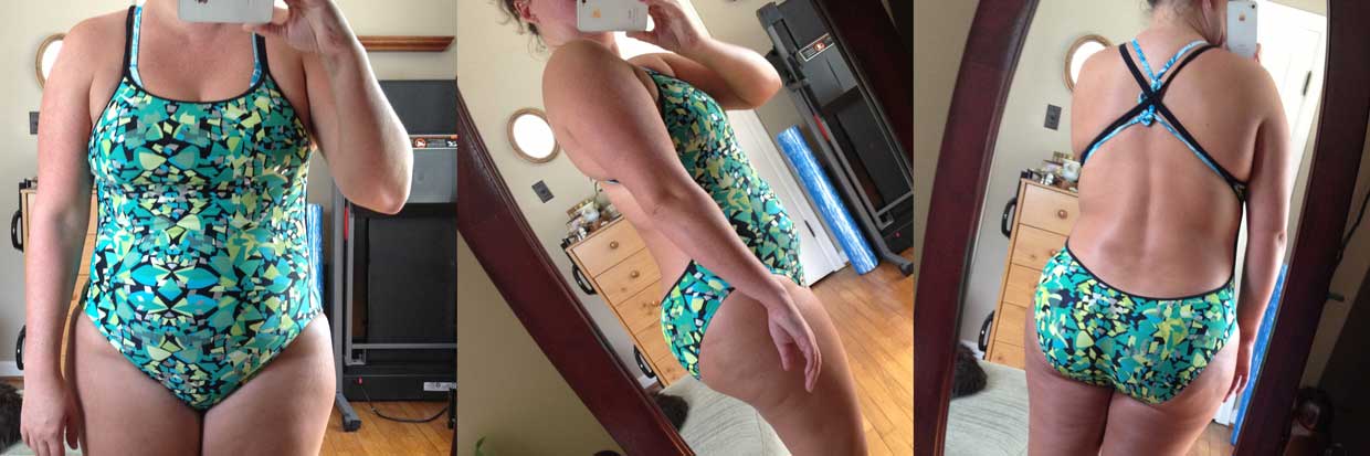 And this is how a bikini top looks under a nike spiderback swimsuit. Yes that’s me. For full disclosure (and maybe to help other people’s perceived weight and body issues) I’m about 5’4″ and 175lbs in these photos. And yes, I don’t look like a “long torso” but when it comes to shopping for swimsuits for some reason I am. These nike suits are one of the few I’ve found that fit as a “regular” and I don’t think they make a tall in these.